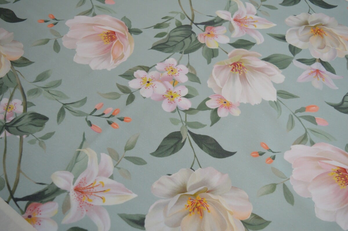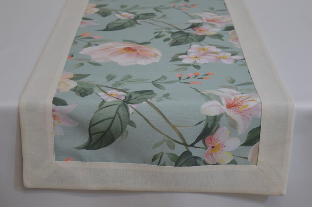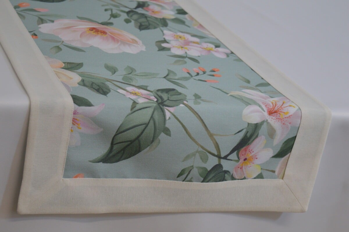 Frissítse fel étkezőjét ezzel az egyedi asztali futóval, amely halványzöld alapon elhelyezkedő nagy rózsaszín virágmintával díszített!