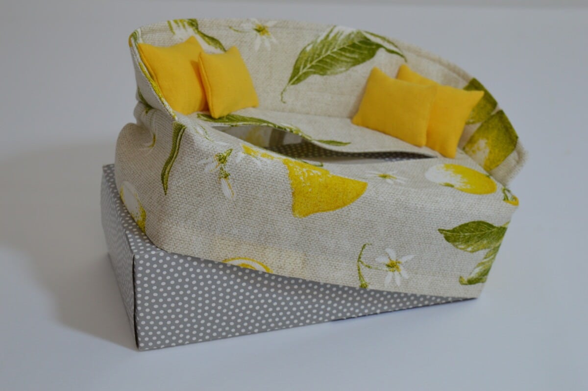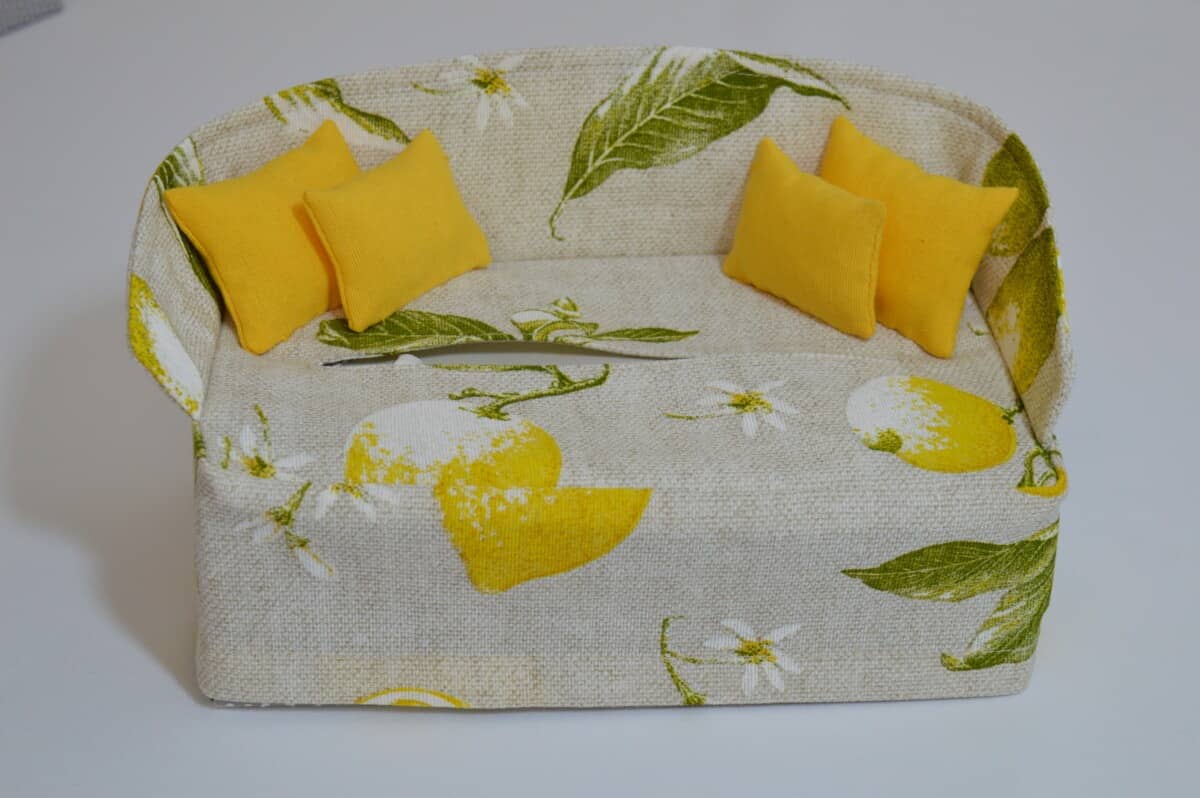 A zsebkendőtartó 60% pamut, 40% polyester összetételű anyagból készült. Mosógépben 30 fokon mosható. Egyszerűen cserélhető, újratölthető. A dobozos papírzsebkendőt öltözteti az otthonához illő “ruhába” üde sárga citrom mintával. Egy doboz papírzsebkendővel szállítjuk.