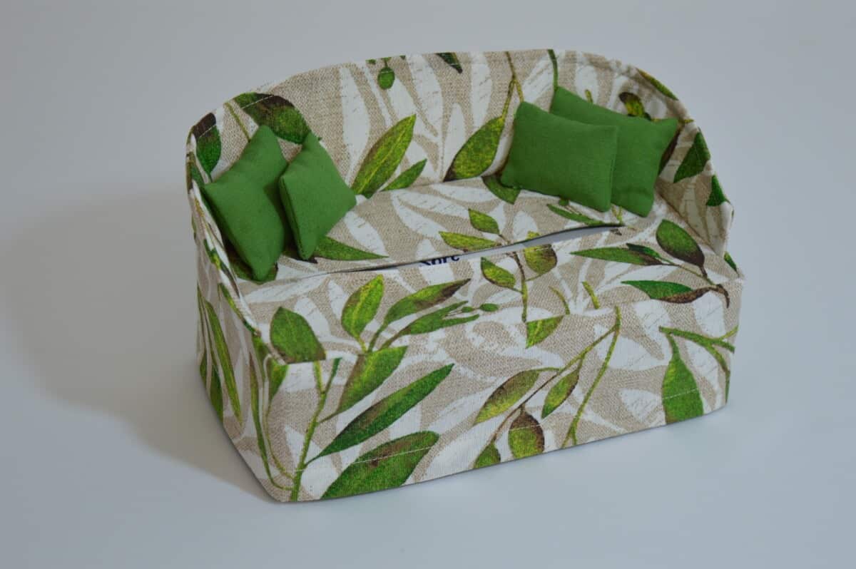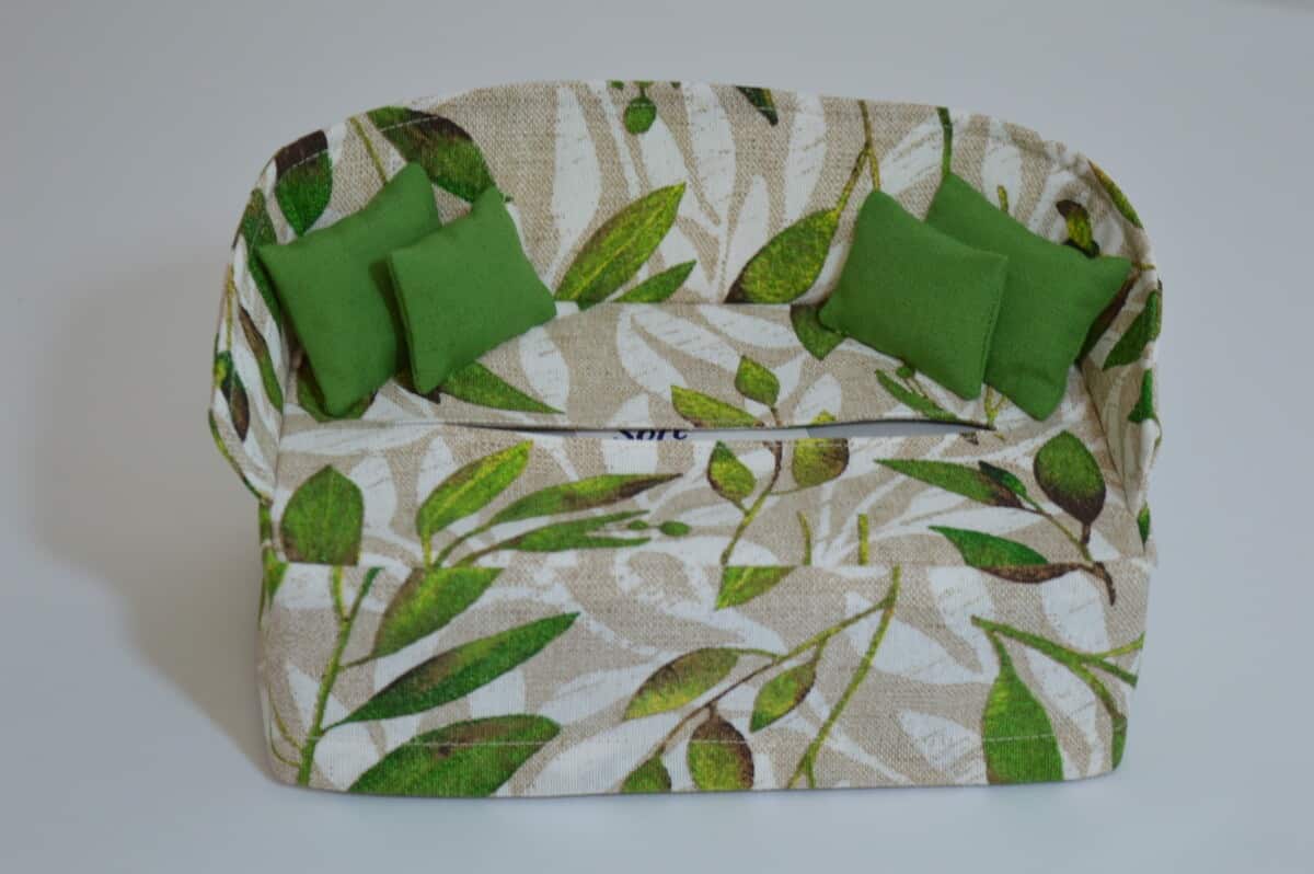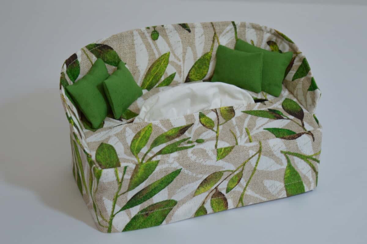A zsebkendőtartó 60% pamut, 40% polyester összetételű anyagból készült. Mosógépben 30 fokon mosható. Egyszerűen cserélhető, újratölthető. A dobozos papírzsebkendőt öltözteti az otthonához illő “ruhába” üde zöld levelekkel. Egy doboz papírzsebkendővel szállítjuk.